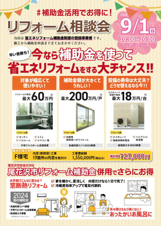 9/1(日)10:00~16:00、当社ショウルームにてリフォーム相談会を開催いたします。