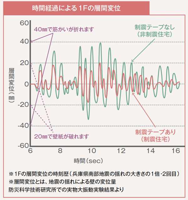 地震による建物の揺れ幅の比較では、制震でない住宅に比べ、制震住宅の揺れ幅はおよそ1/2。制震でない住宅が約40mm変位して筋かいが折れるのに対し、制震住宅は約20mmの変位で壁紙が破れる程度の被害という実験結果となりました。