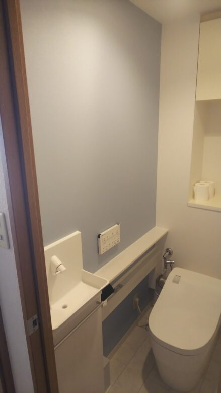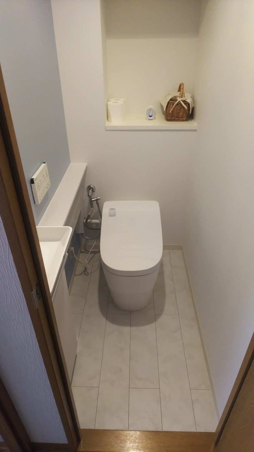 トイレ1dayリフォーム 所在地 山形市 マンションを購入されたとき、キッチン・バス・洗面はリフォームしました。 使ってみてやっぱりトイレもしたいと思い今回リフォームすることになりました。 手洗いタンク付きで、リモコンが脇にあったため掃除がとても大変でした。 クロスは白をメインに、一面だけ淡いブルーでアクセントを付けました。 床は1.5mmのWPBフロアー。色はホワイトオニックス。 トイレはタンクなしのアラウーノL150。 リフォームタイプの手洗いを付けました。 全体的に、明るく広々とした空間になりました。 トイレの機能性も良くなり大変満足して頂けました。