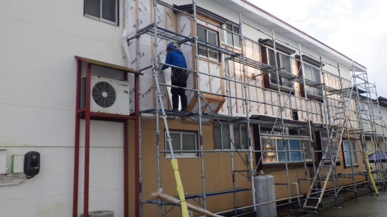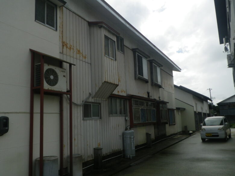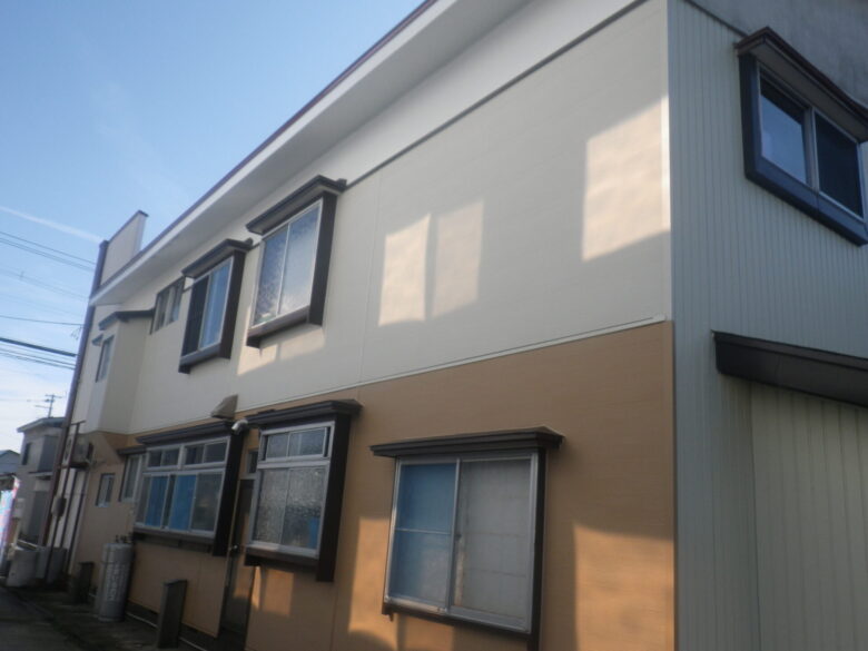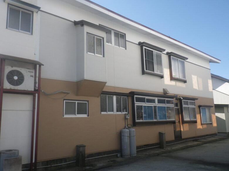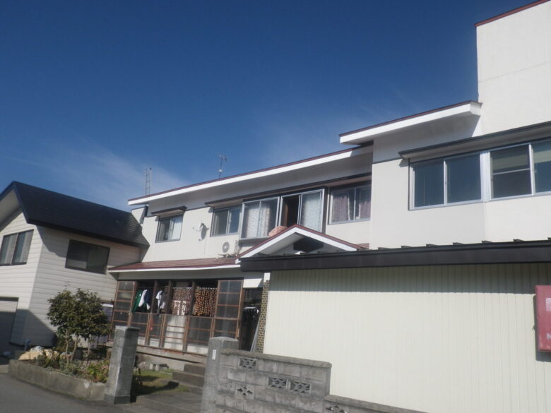 S様邸外壁改修工事 所在地 尾花沢市 長年の雪、雨で劣化部分が目立ってきたのが気になっていました。 寒さ対策で、断熱改修も同時に行いました。 所々錆びてきて、全体的に色あせていました。 断熱材を隙間なく入れて断熱効果を高めました。 見違えるほどきれいになりました。 洋風っぽいツートンでとてもおしゃれです。 玄関側は白で統一。 こちらも素敵ですね。 スッキリした柄の外壁材を横張にすることで印象がガラリと変わりました。 全体的に明るい雰囲気になりました。