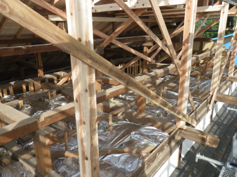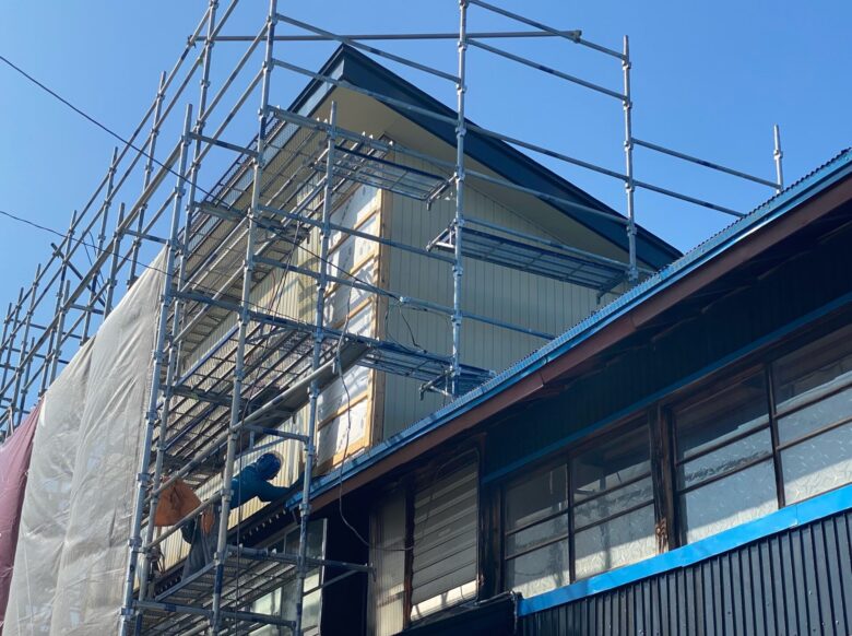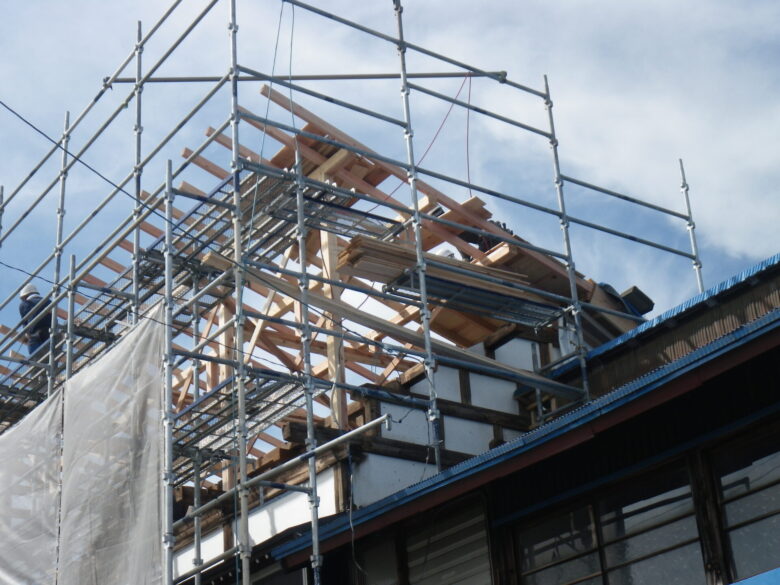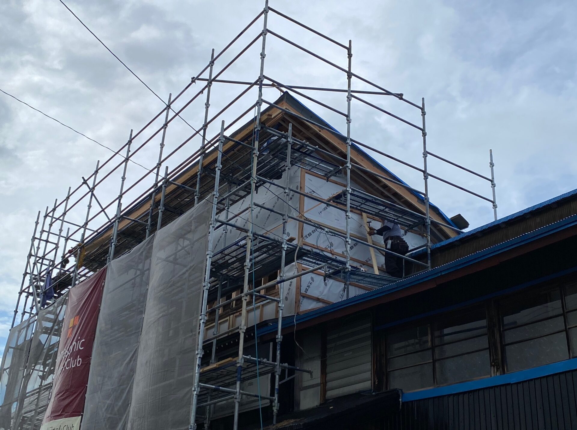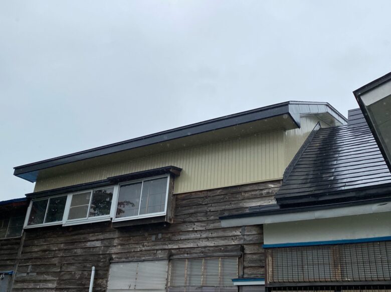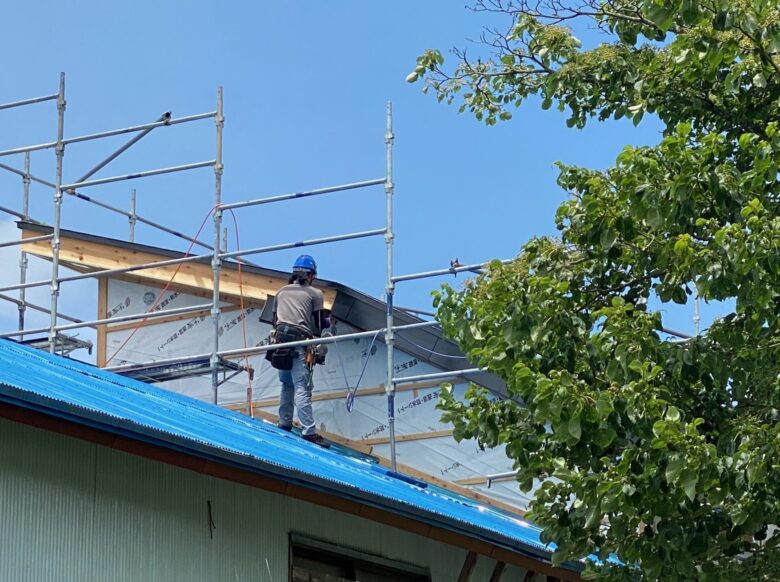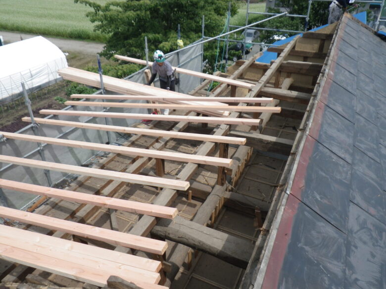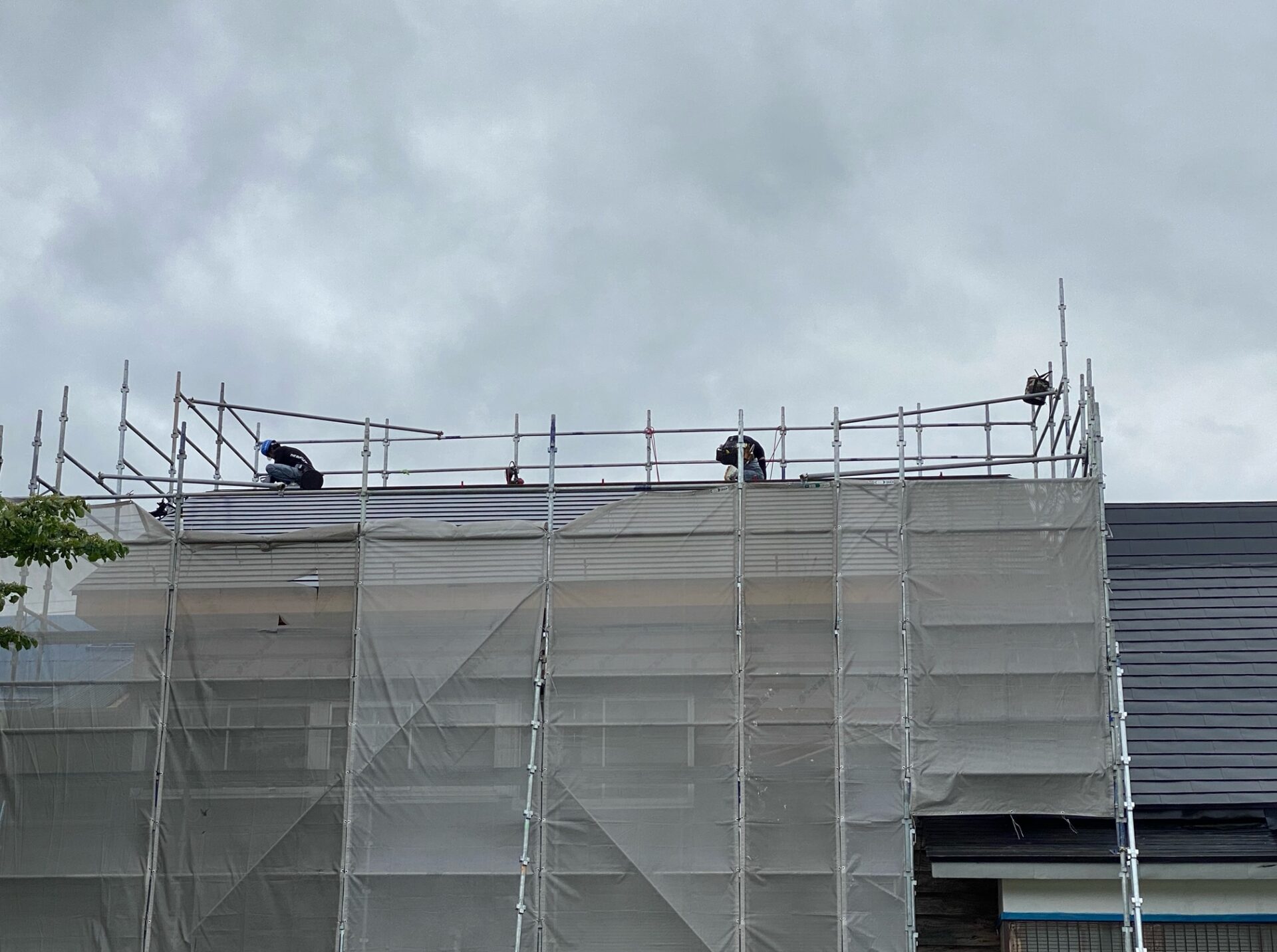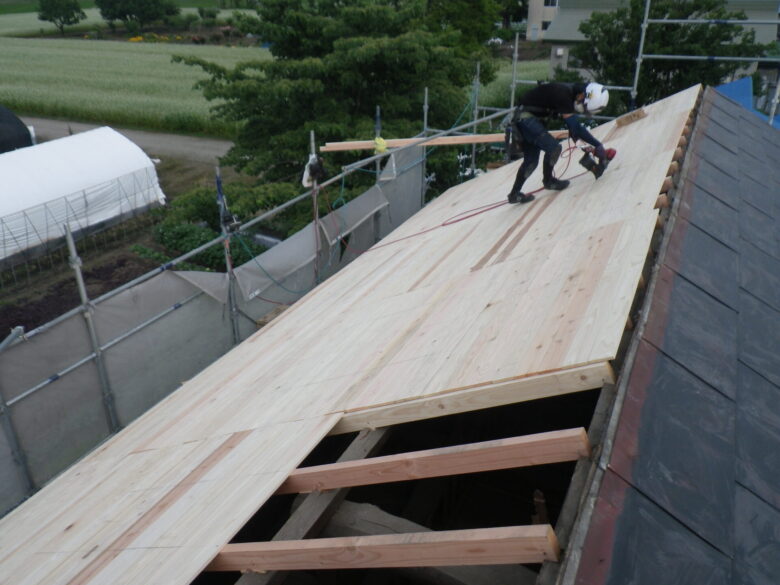 T様邸屋根葺き替え工事 所在地 尾花沢市 去年の大雪。屋根から落ちた雪が道路まではみ出し大変な思いをしました。 トタンもだいぶ古くなっていたので、思い切ってリフォームをしようと決めました。 三角屋根で片方の屋根が道路側を向いていた為、屋根から落ちた雪が道路までいってしまい片付けに苦労していました。 足場をかけいよいよ工事が始まります。 まずは屋根の解体。 暑い中の作業でしたが、あっという間に終わり、次は木工事です。 みるみる屋根らしい形が見えてきました。 断熱材を全面に敷き詰め断熱効果も抜群。 片屋根が姿を見せ始めました。 木工事も終盤。次はいよいよ板金工事です。 屋根の板金作業に、 軒天・破風工事。 外壁工事も終われば完成です。 とても素敵な屋根になりました。 元々の傾斜が急だったので、上げたほうの傾斜を緩やかにしました。 お客様にも大変満足して頂ける仕上がりになりました。 今年の冬どのように雪が落ちるのかとても楽しみです。