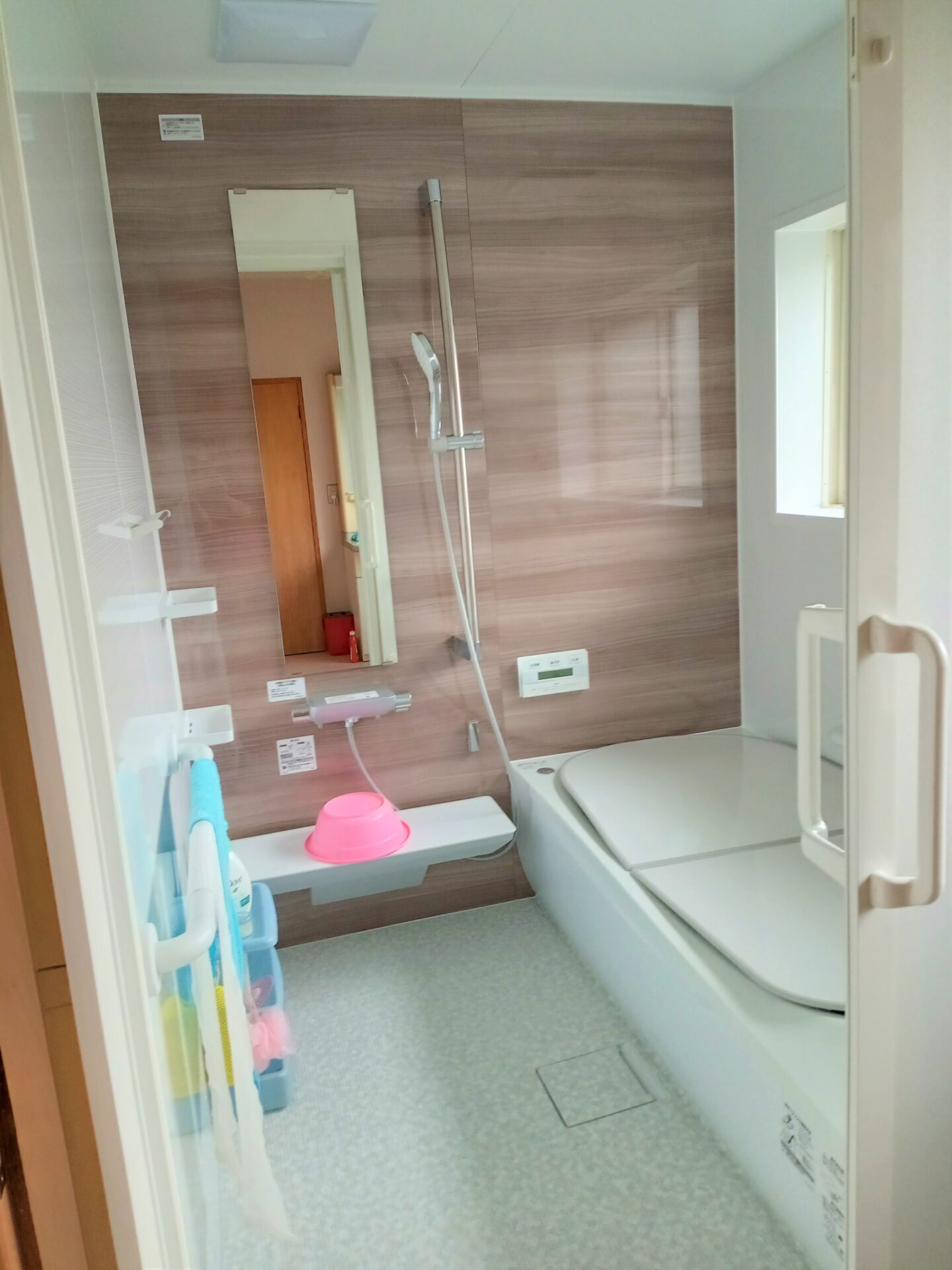 綺麗な木目調のノルディーグレーウッド柄とホワイトがマッチした、素敵な浴室に生まれ変わりました。