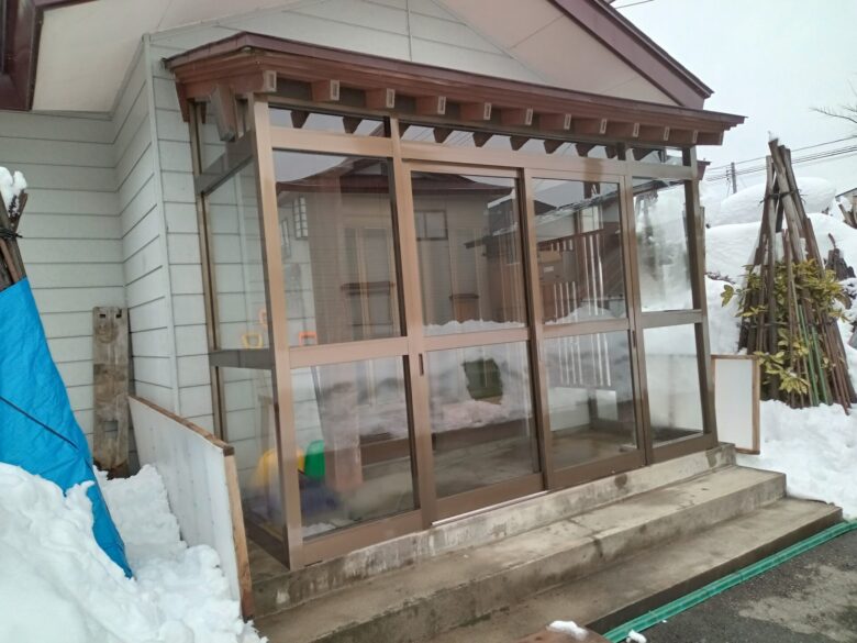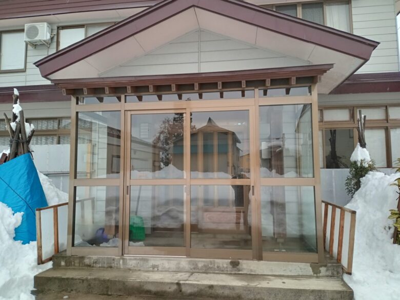 T様邸 風除室設置工事 豪雪地域にとって、冬場の風と雪の対策に玄関の風除室はあったほうがいいアイテムですよね!冷たい風や雪を玄関前でシャットアウトしてくれるため、断熱効果が生まれます。そして、引き違い戸とFIX部の全面にはガラスを使用しているため、明るさを保っています。