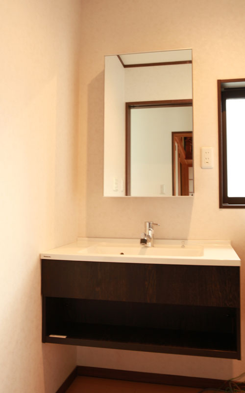 トイレ脇の食器棚の部分は新しい洗面台を取り付け脱衣スペースに。鏡が独立して壁についているので、すっきりとして見えます。