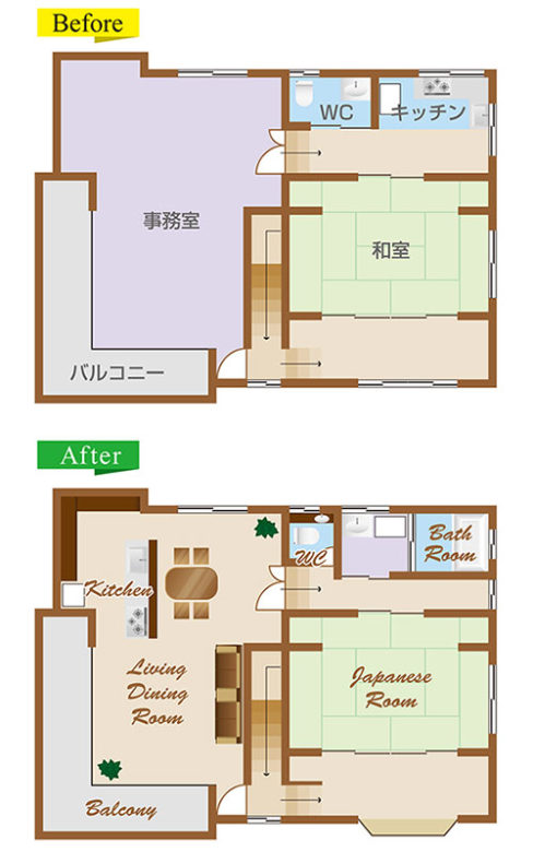 床を明るいイメージのメープル色に張替えしました。元々書庫として使用していた棚をキッチンだなとして再利用し、それに合わせてキッチンとダイニングテーブルを設置しました。